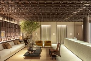 No ambiente Casa Toushi da Duratex, assinado pelo arquiteto Bruno Carvalho, a Celmar foi responsável pelo acabamento das paredes e do teto com painéis em madeira Nogueira Bourbon. A cama no mesmo material e o painel retro iluminado usinado, aplicado no entorno da Casa de Chá, também foram desenvolvidos pela marca, sintetizando o conceito do projeto inspirado na cultura chinesa.