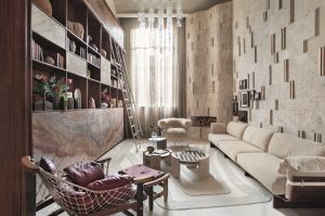 No projeto Eternum Vitae, assinado pela arquiteta Larissa Perna, do La Rous Studio, a marca trouxe soluções inovadoras para o espaço de 30m², como o armário com acabamento curvo, a escada em metalon da Linha Metallo com pintura fosca Color Matte, feita sob medida para a estante de livros, e uma casinha decorativa com topos em 45° e usinagem no acabamento BP Soberano. O ambiente combina referências do mid-century com tendências contemporâneas, resultando em um espaço acolhedor e estiloso.