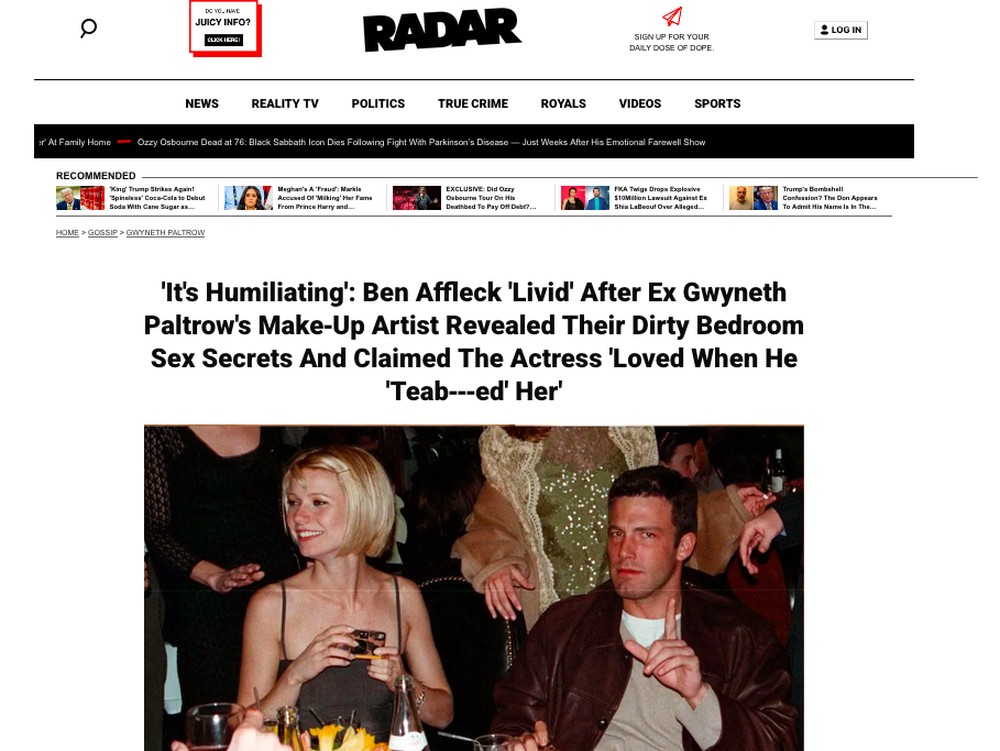 Um trecho do livro de Odell sobre o relacionamento das duas celebridades diz: “Affleck estava lutando contra o alcoolismo e um vício em jogos de azar na época em que conheceu Gwyneth, que se sentiu atraída pela sua inteligência”.