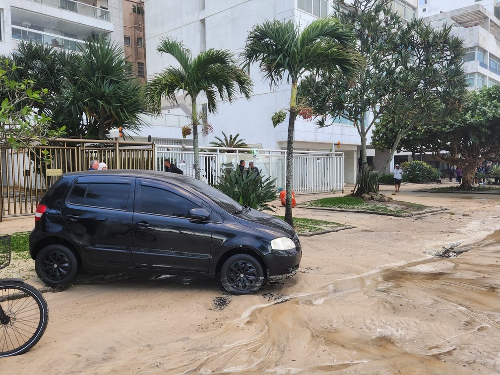 Um carro que estava estacionado no canteiro central e um equipamento de ginástica fixado no calçadão foram deslocados pela força da água.
