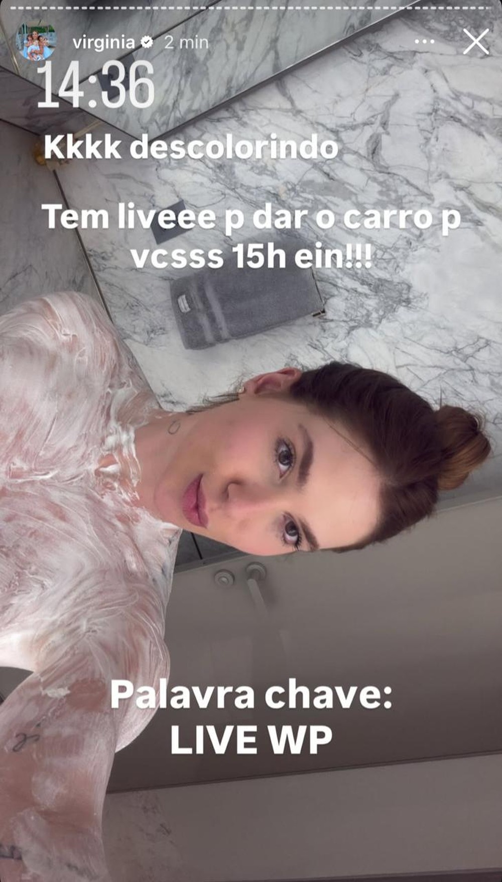 Durante a tarde, Virginia mostrou aos fãs um procedimento estético que realizou em casa: a descoloração dos pelos corporais. Em uma publicação nas redes sociais, a influenciadora aparece nua, com o corpo coberto pelo produto que descolore os pelos, técnica popularmente conhecida como “banho de lua”. O procedimento, que utiliza uma mistura de água oxigenada com pó descolorante, visa clarear os pelos do corpo.