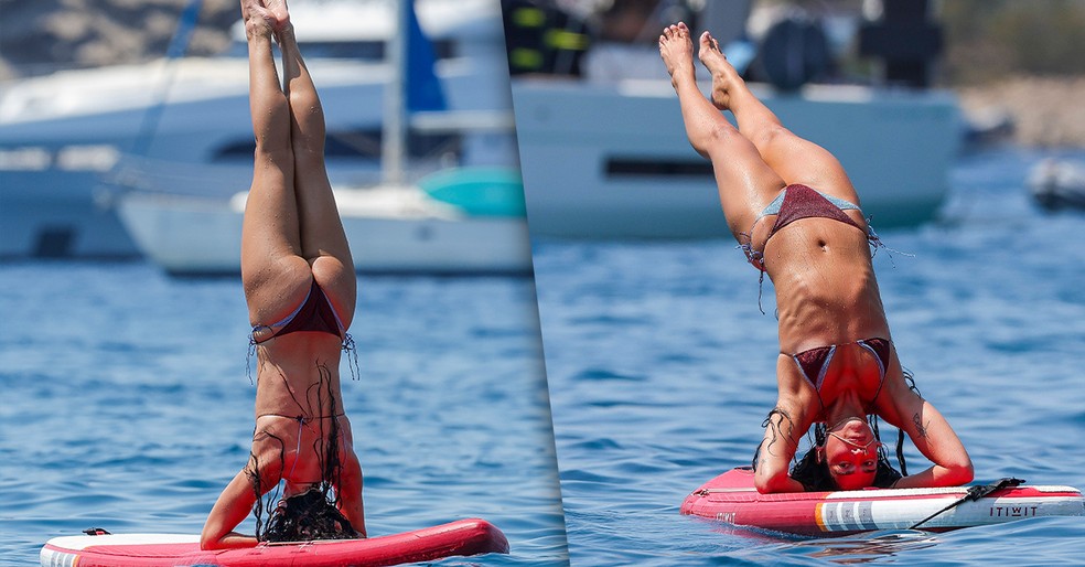 Dua Lipa segue curtindo Ibiza com o noivo e os amigos enquanto celebra a chegada dos 30 anos. E em um momento de descontração com o amado, o ator Callum Turner, mostrou bastante equilíbrio e elasticidade para fazer a posição considerada da rainha das posturas na yoga em cima de uma prancha no meio do mar.