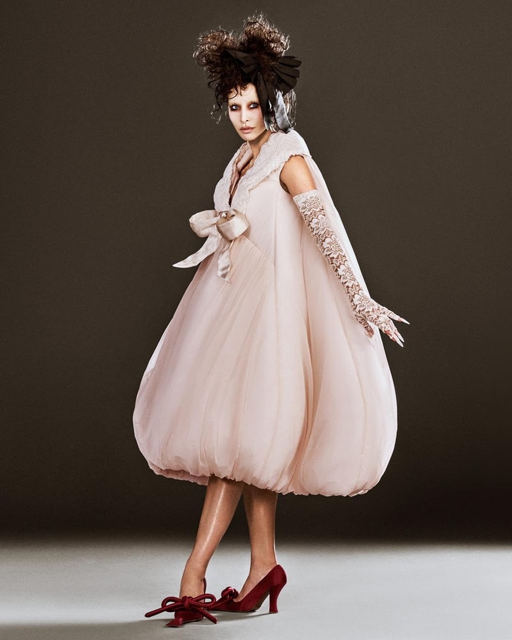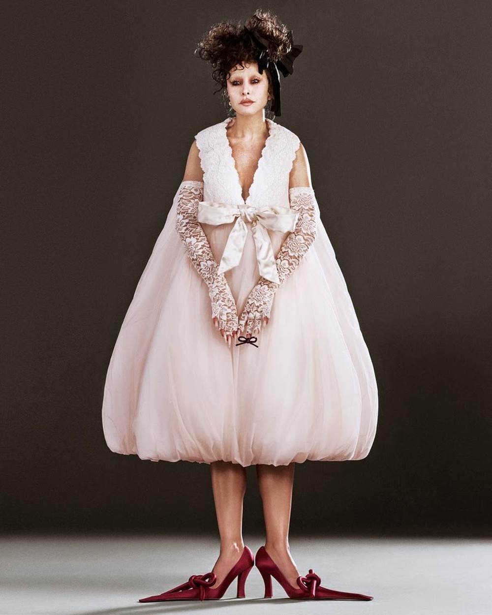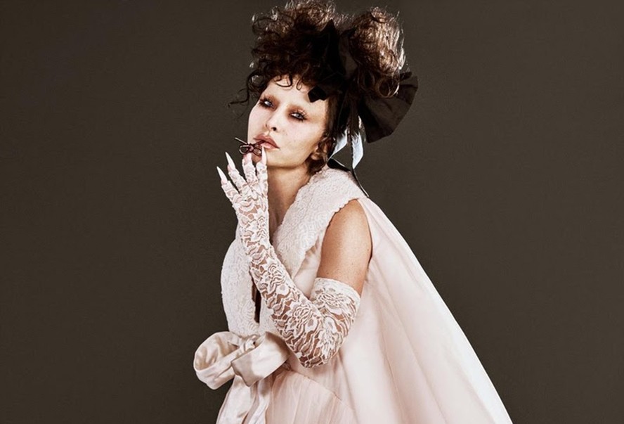 Para as lentes da fotógrada Gabi Schmidt, Sabrina surgiu com um vestido Marc Jacobs Runway Spring 2025, peça que brinca com volumes e silhuetas exageradas. A produção foi complementada por uma peruca loira, lentes azuis e uma sobrancelha fina de época.