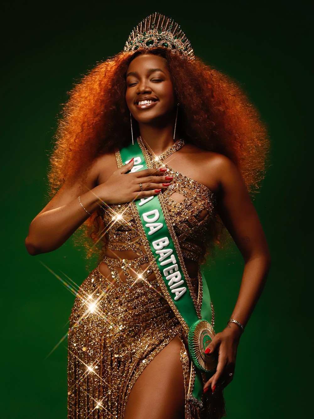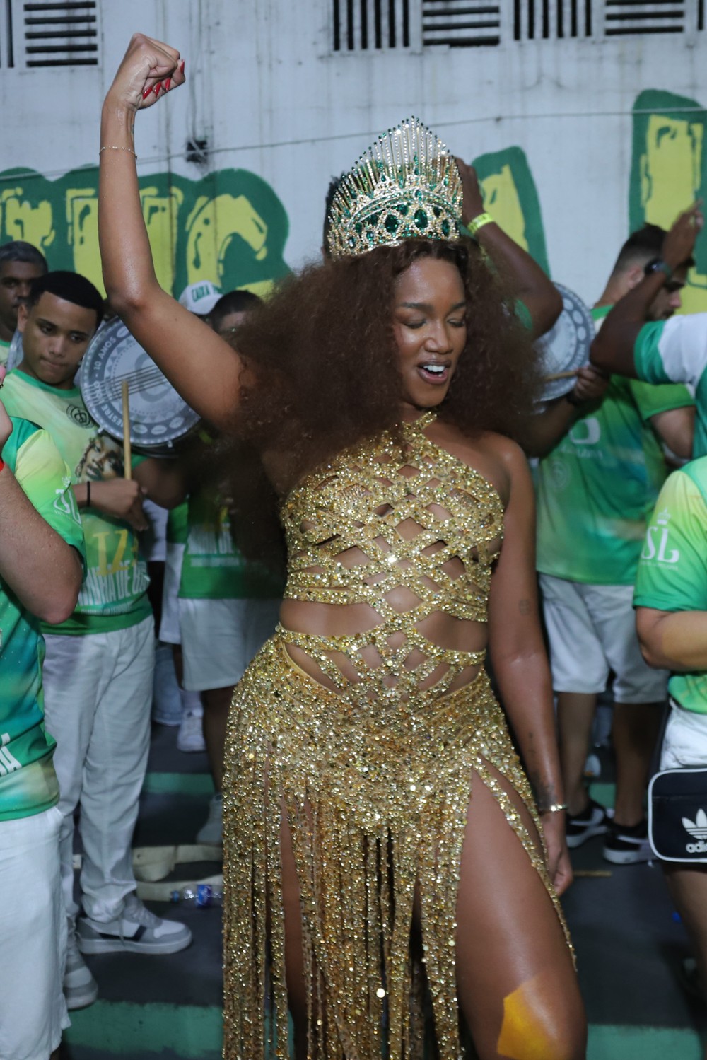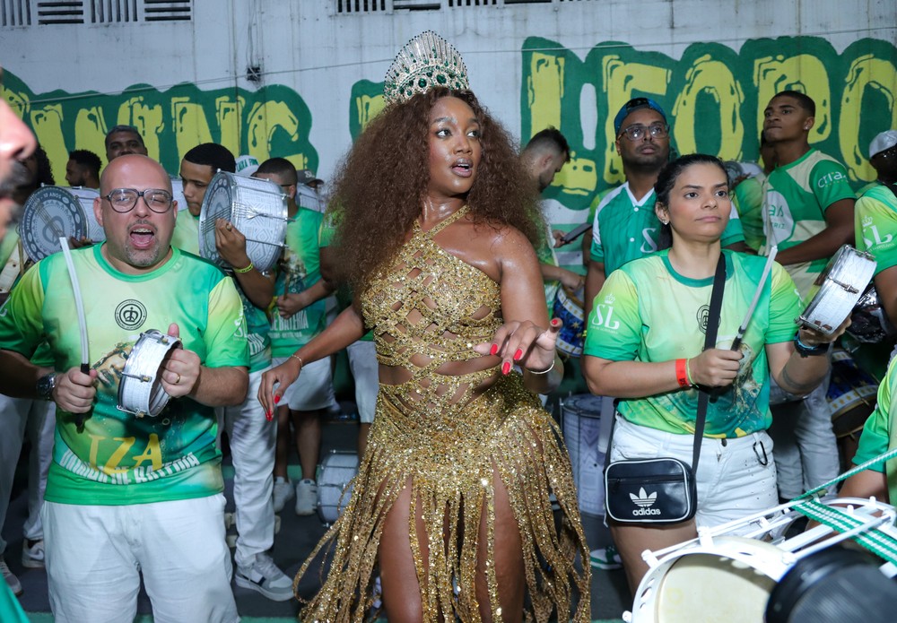 A cantora IZA, de 35 anos de idade, brilhou na quadra da escola de samba do Rio de Janeiro Imperatriz Leopoldinense para sua coroação como rainha de bateria, neste domingo (26). Para a ocasião, a artista, que está solteira após o fim de seu relacionamento com o ex-jogador Yuri Lima, apostou em um look recortado de estampa de oncinha para a feijoada e um dourado, com franjas e muito brilho para a coroação.