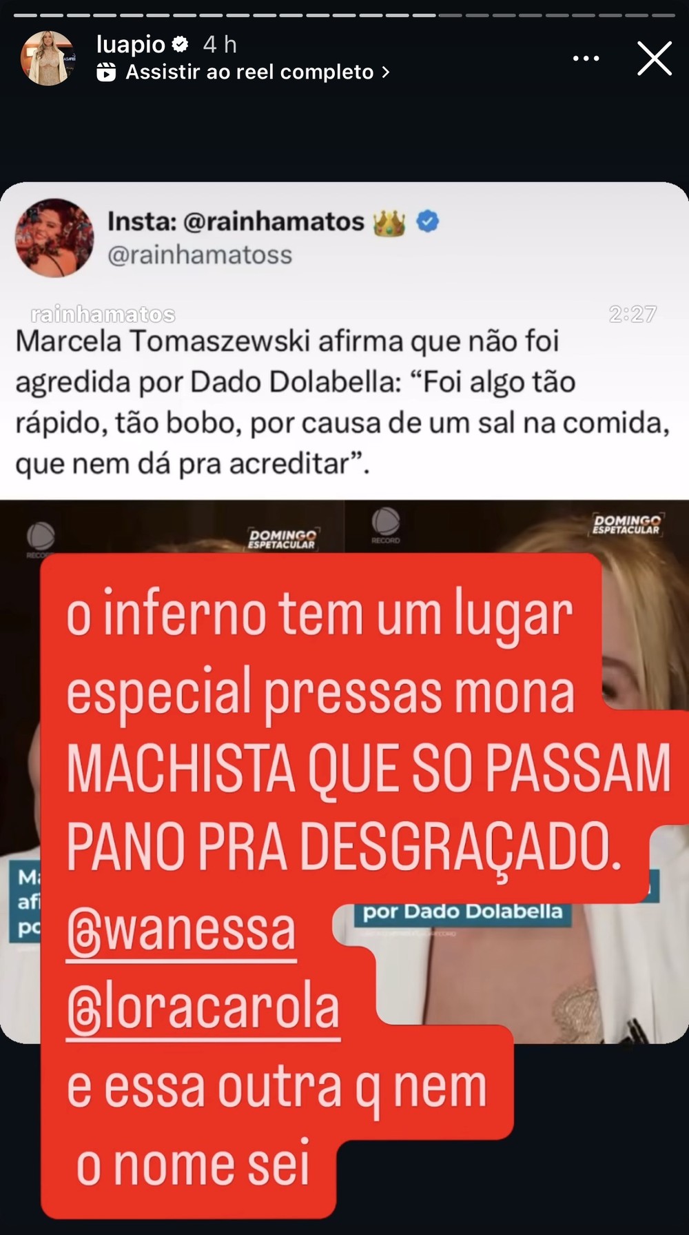 “O inferno tem um lugar especial para essas monas machistas que só passam pano para desgraçado. Wanessa Camargo, Carolina Dieckmmann e essa outra que nem o nome sei”, escreveu Luana em publicação que rapidamente viralizou nas redes sociais.