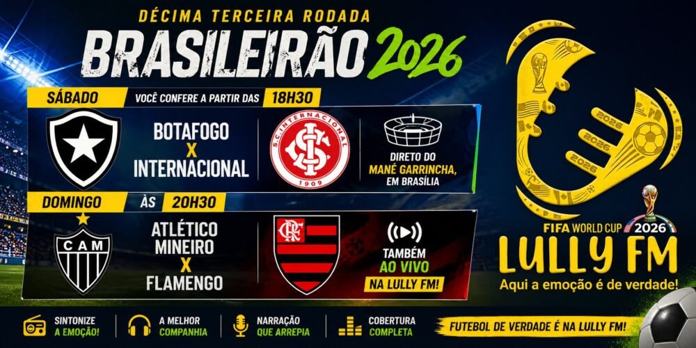 A Lully FM está cada vez mais próxima da transmissão da Copa do Mundo FIFA 26′, no entanto, o esporte não para em nossa grade, neste final de semana tem Brasileirão ao vivo, Botafogo e Internacional se enfrentam no Mané Garrincha, em Brasília, neste sábado, 25 de abril, às 18:30, você confere este jogo ao vivo na Lully FM, já no domingo, 26, o Flamengo vai a Belo Horizonte enfrentar o Atlético, direto da Arena MRV, a partir das 20:30.