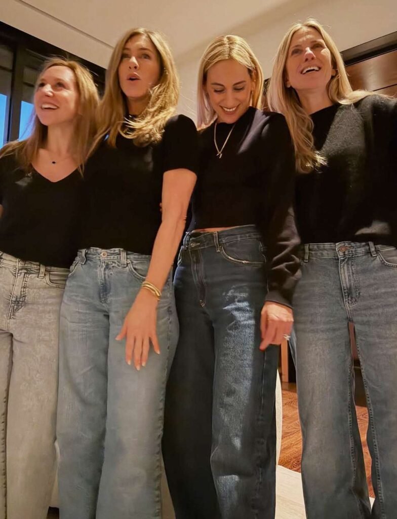 Jennifer Aniston combinou com as amigas um look de primavera simples e atemporal