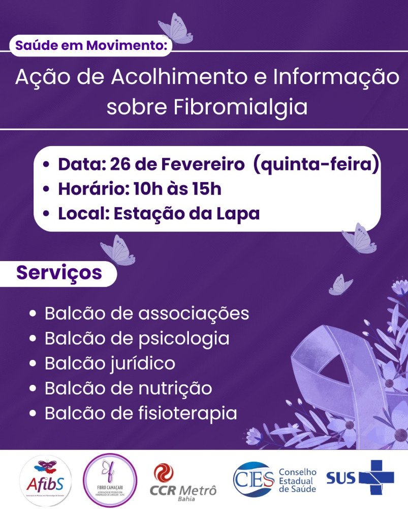 As Associações AFIBS e Fibro Camaçari, em parceria com o Conselho Estadual de Saúde da Bahia (CES-BA) e o Metrô Bahia, promovem uma ação gratuita de conscientização sobre fibromialgia na Estação de Metrô da Lapa, em Salvador, na próxima quinta-feira (26/02), das 10h às 15h. O público contará com serviços de acolhimento, orientação multidisciplinar e atividades voltadas à melhoria da qualidade de vida de pessoas com a síndrome.