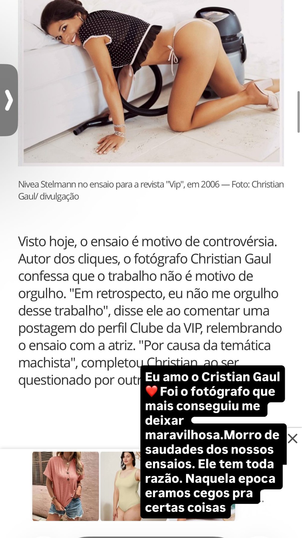 Nivea Stelmann usou as redes sociais neste sábado (25) para relembrar um ensaio sensual que realizou para a revista VIP em 2006. As fotos controversas foram tiradas pelo fotógrafo Christian Gaul, que na última semana disse se arrepender da temática ‘machista’ dos cliques – a atriz disse concordar com a fala, mas disse ‘morrer de saudades’ dos trabalhos que fez com ele.