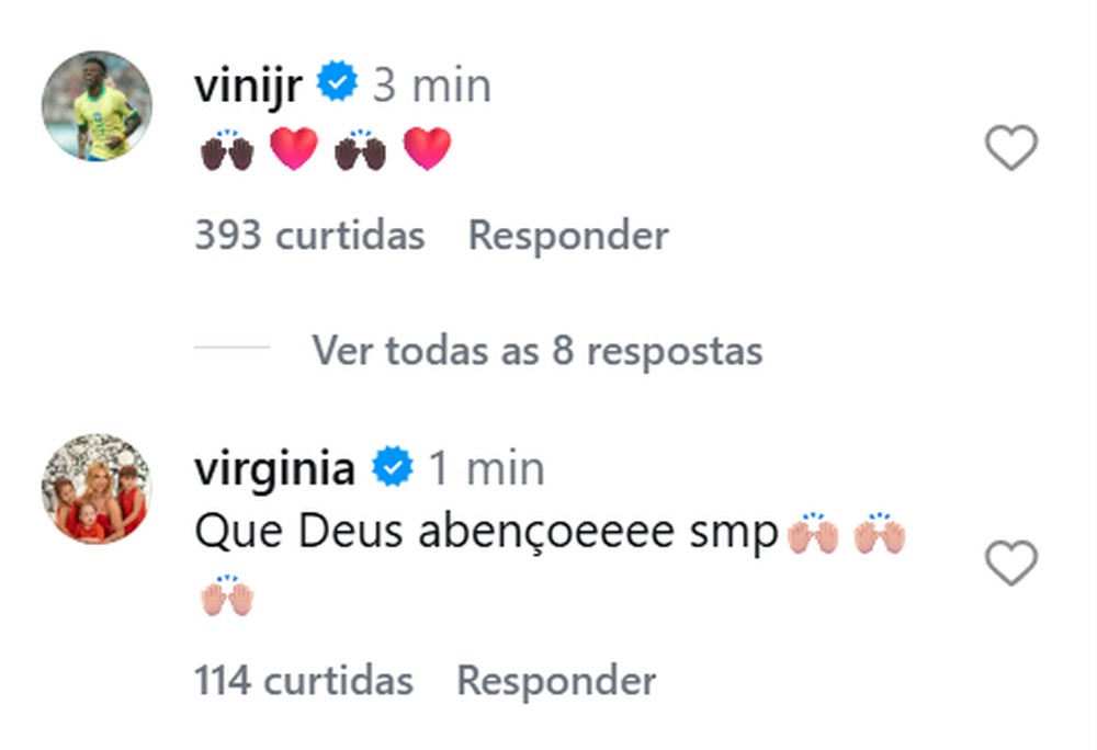 Virginia Fonseca e Vini Jr. celebraram a gravidez de Tainá Militão com Eder Militão e deixaram mensagens de carinho nas redes sociais. Nos comentários da publicação, Virginia escreveu “Que Deus abençoe sempre”, enquanto Vini Jr. reagiu com emojis de coração, demonstrando apoio ao casal.