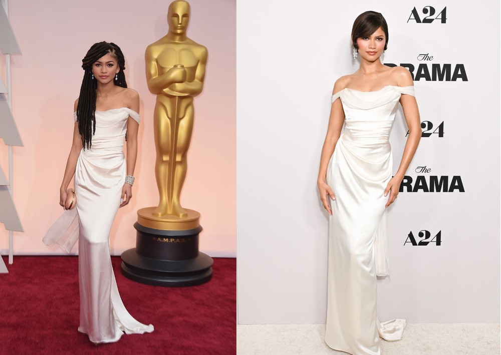 Zendaya, de 29 anos, é a favor da moda sustentável. A atriz repetiu o vestido branco de seda Vivienne Westwood usado na cerimônia do Oscar 2015 para a première de seu novo filme, The Drama, em Los Angeles (EUA). O evento foi realizado na terça-feira (17), e também teve a presença do coprotagonista Robert Pattinson.